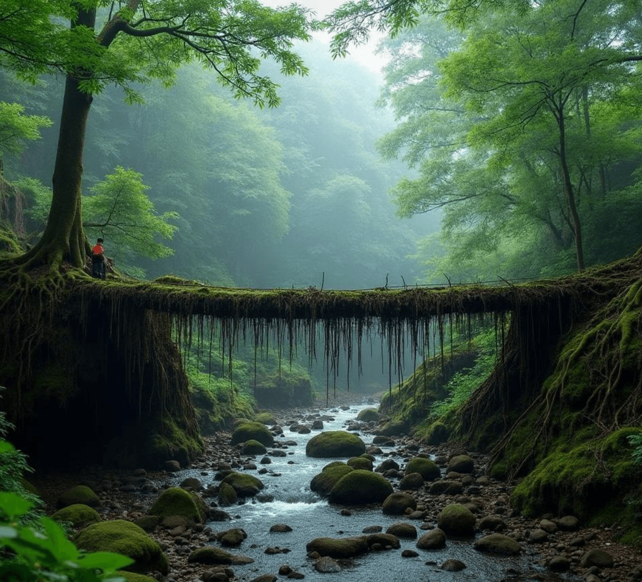 A scenic state known for living root bridges, waterfalls, serene villages, and untouched